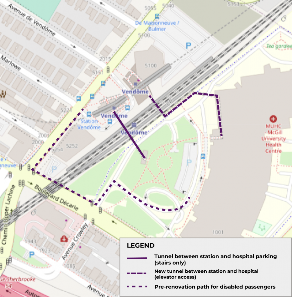 The complexity of the issue of accessibility at this location is compounded by the multiple stakeholders who have a stake in the area. The MUHC, the STM, and Canadian Pacific Railway (who own the tracks) all had to communicate and work together in order to make this project happen. It is understandably difficult to achieve this level of coordination, but it is so crucial for a public service project of this size and nature to account for the accessibility needs of those who will use it. Yet, the lack of connectivity between Vendôme and the MUHC exhibits once again that point-to-point transit accessibility is often an afterthought.